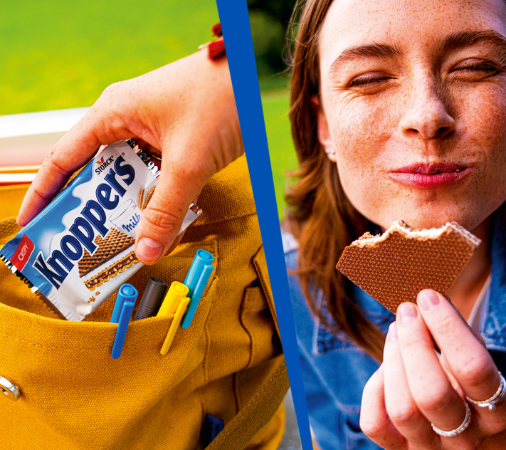Ever since Knoppers was launched in 1983 in Germany, the milk-hazelnut wafer has been popular: Five delicious layers of crispy baked wafers, milk crème, creamy hazelnut filling, and crunchy roasted hazelnut pieces, topped with a touch of cocoa. Whether at work, at home, or on the road – take a relaxing break with a crispy, tasty Knoppers.